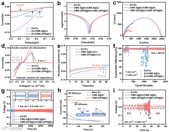 CMK-5/PS 界面层表现出很强的锌亲和性,能够在 0.5 mA cm-2 的条件下在 8000 小时内实现长期的循环稳定性,且在对称电池中的电压滞后小(约 40 mV)。CMK-5/PS@Zn//Cu 对称电池显示出较低的成核过电位(23.3 mV),并在 2000 次循环中实现了 99.2%的库仑效率。