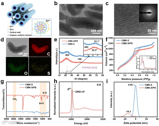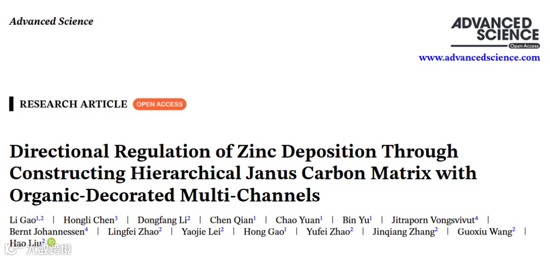 近日,来自悉尼科技大学的刘浩教授,汪国秀院士,张晋强博士和赵玉飞博士,在国际知名期刊Advanced Science上发表题为“Directional Regulation of Zinc Deposition Through Constructing Hierarchical Janus Carbon Matrix with Organic-Decorated Multi-Channels”的研究文章。该文章设计了具有有机修饰多通道孔隙的分级型Janus CMK-5 碳基质在锌金属负极上构建功能性的界面层(CMK-5/PS@Zn)。这种独特的设计促进了电荷梯度驱动的锌沉积,使锌仅限于管状通道内,同时具有高电子导电性和离子导电性,有效地防止了枝晶形成和副反应。这为开发无枝晶的水性锌离子电池金属阳极提供了一种实用的界面改性策略。