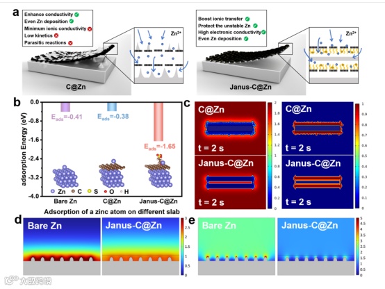 图1. 锌负极上Janus碳基调控锌定向沉积的理论计算与模拟。(a)锌阳极上增强性能的界面层示意图。(b)锌原子在不同衬底表面的吸附能。(c)COMSOL模拟了C@Zn和Janus-C@Zn阳极上Zn沉积过程中Zn2+离子浓度分布(左)和枝晶生长(右)。COMSOL模拟了的(d)Zn2+离子浓度分布和(e) C@Zn和Janus-C@Zn阳极电场分布。
