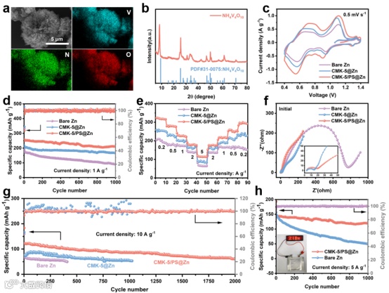 水性锌离子电池,采用 CMK-5/PS@Zn 作为阳极材料,NH4V4O10 作为阴极材料,经过 1000 次循环后仍能保持出色的循环稳定性,其单体容量高达 213.8 mAh g-1,在 1 A g-1的电流下表现优异,这凸显了其在工业应用中制造耐用的锌离子电池的潜力。