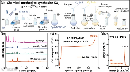 为了推动KO2实用化,团队进一步开发了一种基于联苯(Bp)/二乙二醇二甲醚(DEGDME)体系的常温化学合成法(图3)。利用Bp/DEGDME溶液和金属K接触后释放的溶剂化电子捕捉气相O2,仅需5分钟即可在室温下快速沉淀出高纯度KO2粉末。该方法的成本仅为商业产品的1/3左右,且合成产物在比容量(~369.3 mAh/g)和电压释钾分解平台方面与商业材料高度一致,极具产业化潜力。