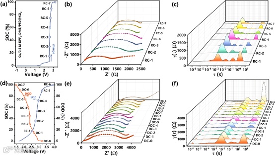 图5 (a)0.5M KPF6/DME电解液中Cu/P50@KO2电池的代表性充电曲线。(b)EIS图及相应的(c)DRT分析。(d)0.5M KPF6/DME电解液中e-K/PTCDA电池的代表性电化学曲线。(e)EIS图及相应的(f)DRT分析。
