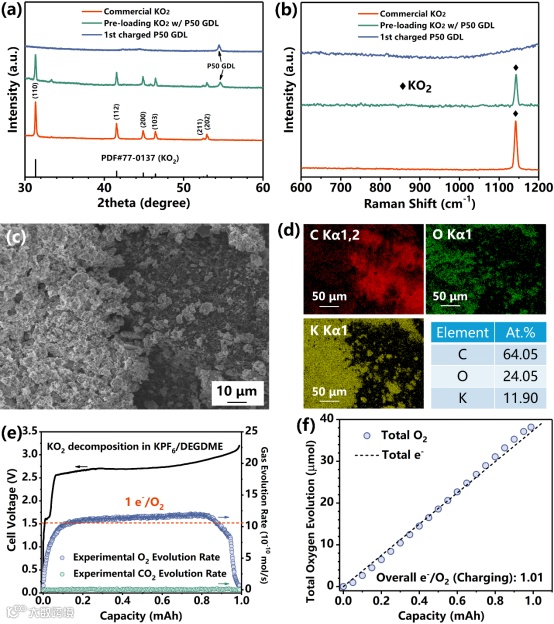 图1 预负载KO2的GDL在充电前及充电分解后的(a)XRD谱图与(b)Raman光谱。为便于比较,还添加了商用KO2信号。预负载KO2的GDL(c)SEM和(d)EDS分布图。(e)Cu/P50@KO2电池充电过程中原位DEMS监测的气体(O2和CO2)释放速率。(f)不同充电状态下释放的O2总量(虚线表示与容量相对应的转移电子数)。电流为0.1 mA。