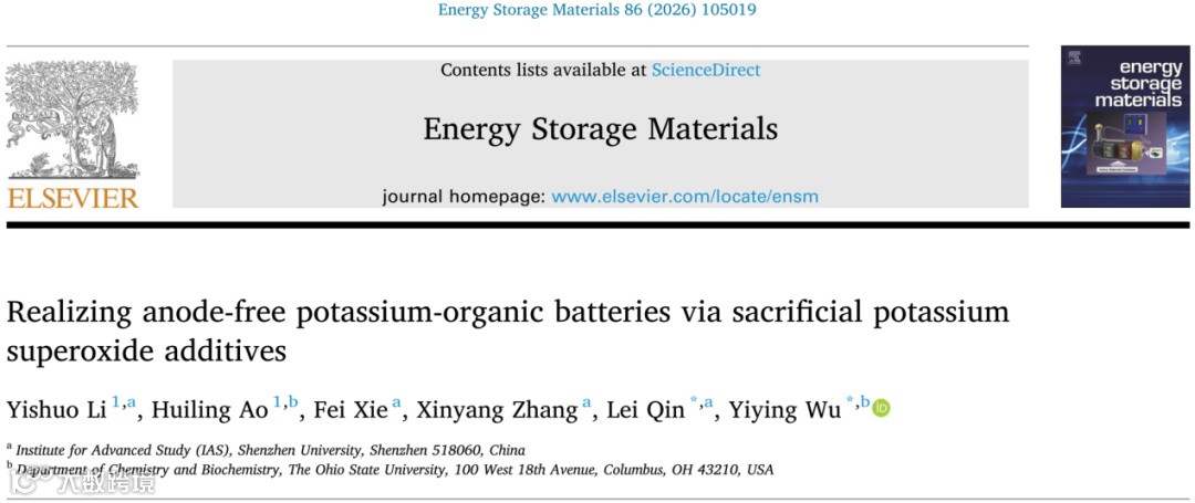 无负极全电池架构(Anode-free configuration)通过直接在集流体上原位电沉积钾金属,展现了极高的能量密度与安全性优势,但无负极有机钾电池的核心挑战在于正负极两侧均完全缺失初始钾离子(K+)源。虽然锂/钠体系已有相关牺牲添加剂的探索,但传统氧化物或过氧化物添加剂往往受限于迟缓的分解动力学、较低的有效容量以及副反应产生的有害固体残留。超氧化钾(KO2)作为钾-氧气电池的唯一放电产物,具有理论比容量高(377 mAh/g)、热力学稳定且分解电压低(低于3.2 V)的特性。最关键的是,其分解过程仅释放钾离子与氧气,能够实现“无残留”的钾源补偿,但此前尚未见其在钾离子电池领域的相关应用报道。