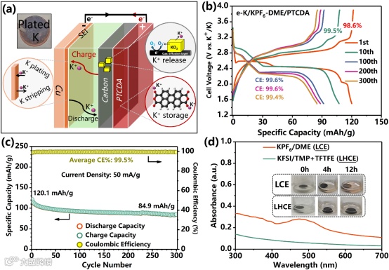 在概念验证阶段,团队成员组装了Cu/PTCDA@KO2无负极全电池(图4)。首周充电时,K+从正极KO2中释放并原位沉积于铜箔负极,成功充当了全电池的“钾离子仓库”。该体系在300次循环中表现出优异的比容量(初始~120.1 mAh/g)和高达99.5%的平均库伦效率。此外,研究还通过吸光度实验对比了低浓度电解液(LCE)与局部高浓度电解液(LHCE)对有机正极PTCDA溶解的影响,指出了未来提升稳定性的优化方向。
