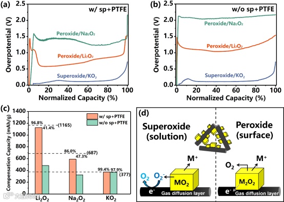 图2 比较了商用Li2O2、Na2O2和KO2在分解(ab)过电位和(c)容量方面的补偿效率。补偿固体在(a)有和(b)无导电剂+粘结剂混合的情况下进行性能比较。图(c)中的虚线分别代表Li2O2、Na2O2和KO2的理论比容量值。(d)超氧化物和过氧化物的分解路径及机制比较示意图。