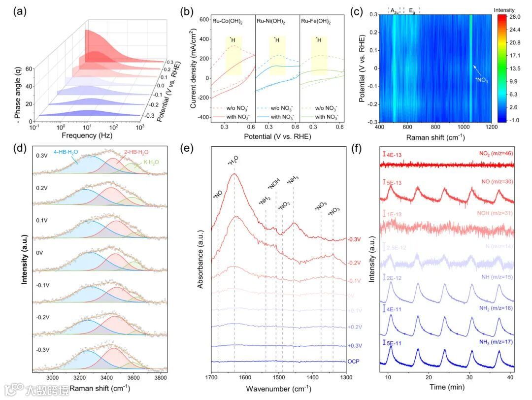 原位EIS测试中,Ru-Co(OH)2催化剂的相角迅速下降并向高频方向移动,表明其具有优异的水解离能力。不含有NO3-时,Ru-Co(OH)2催化剂显示出比Ru-Ni(OH)2和Ru-Fe(OH)2催化剂更强的*H特征峰强度,表明Co(OH)2载体具有更强的*H生成能力。原位Raman中不同电位下稳定的Raman峰揭示了Co(OH)2载体优异的结构稳定性。更重要的是,Ru-Co(OH)2催化剂表现出最高的2-HB·H2O含量和最低的4-HB·H2O含量,这表明Co(OH)2载体能够有效削弱界面水分子间的氢键相互作用,促进H2O解离,从而提供更丰富的*H物种以驱动电催化NO3-RR的高效加氢转化。原位红外和原位电化学微分质谱检测NO3-RR反应过程中的中间产物,推测反应路径为:*NO3 → *NO2 → *NO → *NOH → *N → *NH → *NH2 → *NH3(图3)。