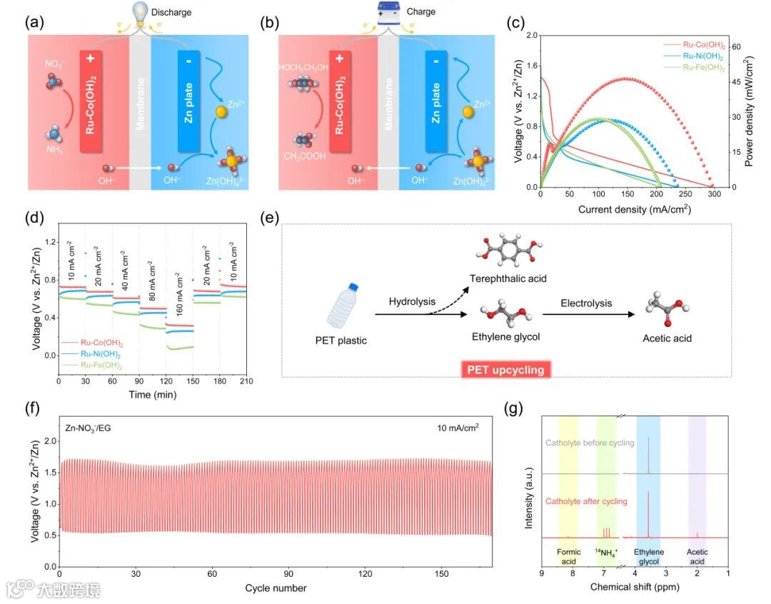 该工作进一步构筑了一种可充电式Zn-NO3-/EG电池系统(图5)。其中Ru-Co(OH)2和锌片分别作为正极和负极材料,中间用阴离子交换膜隔开。放电过程中,正极侧发生NO3-RR反应生成NH3,而负极侧锌片发生氧化;而充电过程中,正极侧乙二醇被氧化为乙酸,负极侧Zn(OH)42重新被还原为金属锌。此外乙二醇可以来源于废弃的PET塑料。所组装的Zn-NO3-/EG混合电池系统在充放电过程中具有良好的稳定性,充电过程氧化产物乙酸可与放电过程NO3-RR生成的NH3结合,形成高附加值的醋酸铵,从而在能量存储与转换的同时,实现硝酸根污染物和塑料废弃物的协同增值转化,充分体现了“变废为宝”的设计理念。