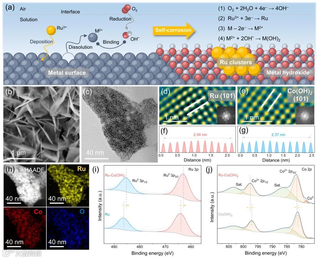 通过自腐蚀法制备了金属氢氧化物负载Ru团簇催化剂。在Ru3+与O2的双重腐蚀作用下,金属基底表面的金属(M)原子被氧化并以M2+离子形式溶出。在阴极半反应中,空气中的O2被还原为OH-,同时Ru3+被还原为金属Ru。随后,M2+离子与OH-配位形成金属氢氧化物M(OH)2,而金属Ru原子进一步沉积在M(OH)2表面,最终形成M(OH)2负载Ru团簇催化剂。M(OH)2载体与金属Ru之间存在电子转移,适中的金属-载体相互作用可以有效调节反应物和中间体的吸附性能,从而影响硝酸盐电还原的电化学性能。