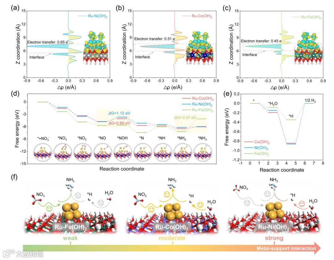 密度泛函理论(DFT)计算进一步揭示了金属-载体相互作用对电催化NO3-RR性能的调控机制。Ru-Fe(OH)2催化剂的金属-载体相互作用较弱,表现出过强的NO3-吸附和受限的*H供应,从而限制了NO3-RR的加氢过程;与之相反,Ru-Ni(OH)2催化剂因金属-载体相互作用过强,削弱了其对NO3-的吸附,导致其NO3-RR活性下降。相比之下,Ru-Co(OH)2催化剂得益于适中的金属-载体相互作用,可以协同优化NO3-吸附与水解离产*H,从而促进了硝酸根向氨的高效加氢转化。