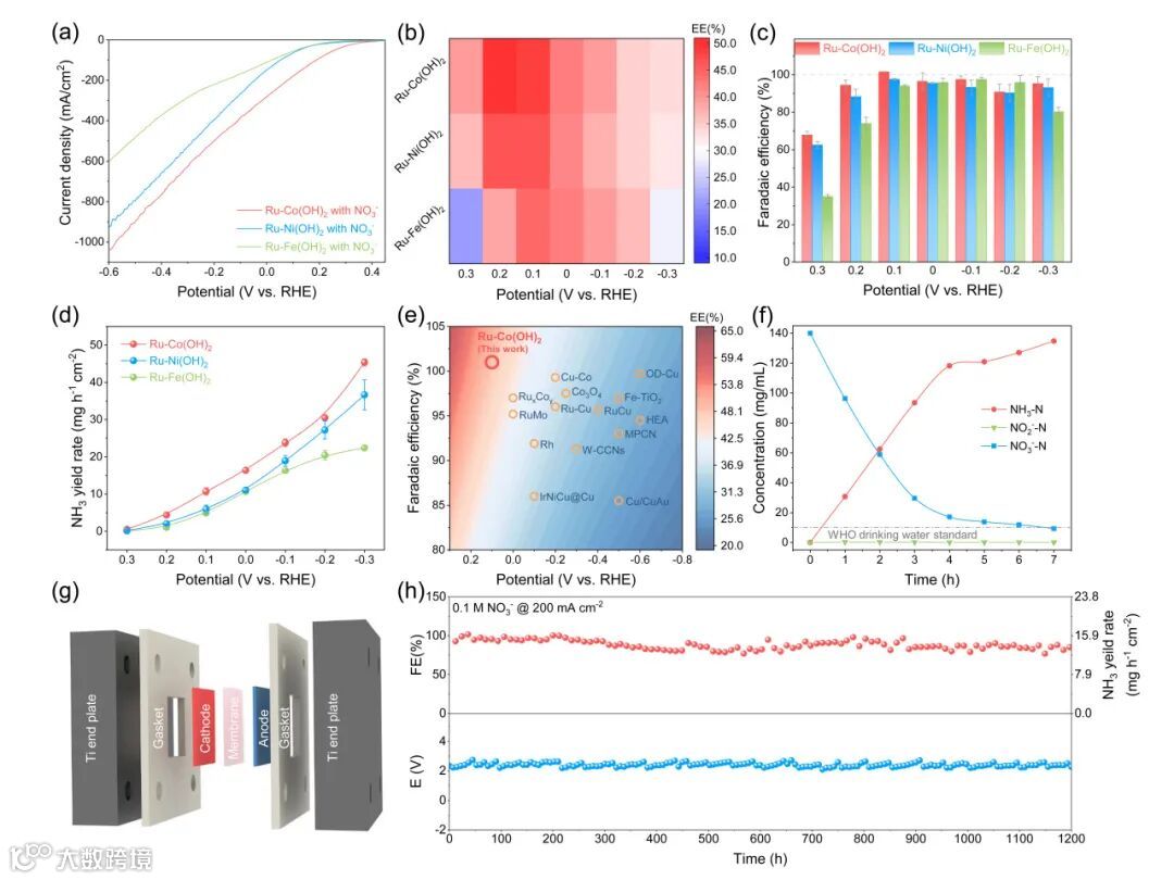 Ru-Co(OH)2催化剂在0.1 M NO3-电解液中的反应开启电位为+0.49 V vs. RHE,接近于NO3-RR的理论反应电位(+0.69 V vs. RHE)。此外,Ru- Co(OH)2催化剂+0.2 V vs. RHE的正电位下实现了49.5%的能量效率,并在+0.1 V vs. RHE下达到接近100%的高法拉第效率。在0.3 V vs. RHE下的产氨速率为45.4 mg h1 cm2,在膜电极电解槽中,Ru-Co(OH)2催化剂在200 mA cm2电流密度下可以实现长达1200小时的NO3-RR稳定性测试,其电催化NO3-RR综合性能超过多数同期报道的催化剂(图2)。