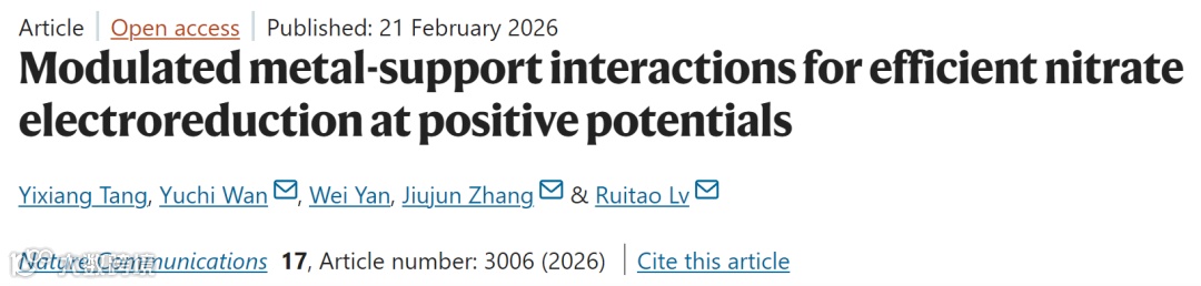 Yixiang Tang, Yuchi Wan*, Wei Yan, Jiujun Zhang*, Ruitao Lv*, Modulated metal-support interactions for efficient nitrate electroreduction at positive potentials. Nature Communications, 17, 3006 (2026).
