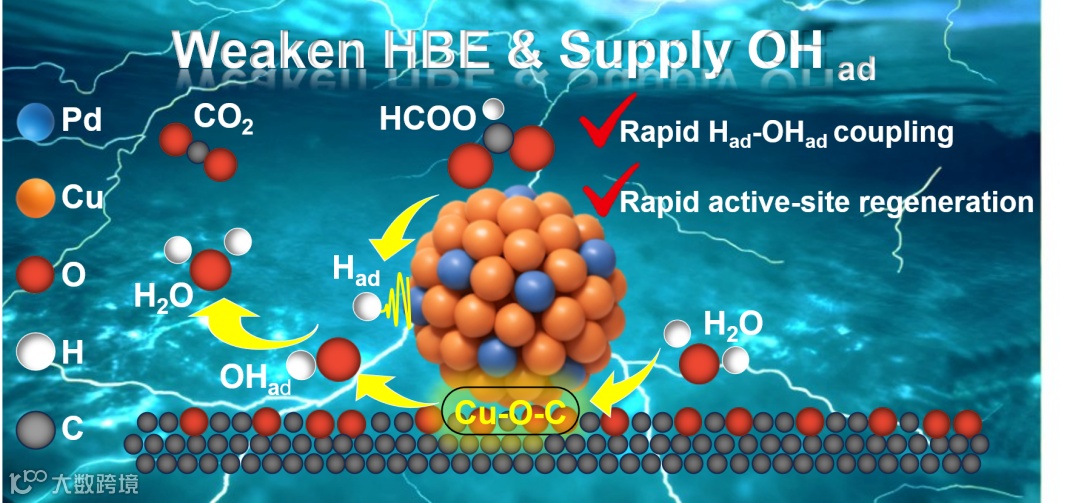 直接甲酸盐燃料电池(Direct Formate Fuel Cells, DFFCs)因能量密度高、可室温运行以及碱性体系安全性较好等优势,被认为是便携式和备用电源领域具有应用前景的清洁能源技术。然而,作为阳极关键反应的甲酸盐氧化反应(FOR)仍然面临两大瓶颈:一方面,Pd基催化剂在反应过程中容易受到吸附氢(Had)等中间体强吸附毒化,活性位点再生缓慢,导致反应动力学受限;另一方面,为获得足够高的电流密度,传统Pd基催化剂通常需要较高的Pd负载,进而带来较高成本。论文指出,FOR遵循“吸附—脱氢—耦合脱附”路径,其中Had与OHad的耦合是速控步骤;现有策略通常分别从削弱Pd-H键合强度或增强界面OHad供给两方面入手,但如何在低Pd负载条件下将这两种功能集成到同一界面中,仍是该领域尚待突破的关键问题。