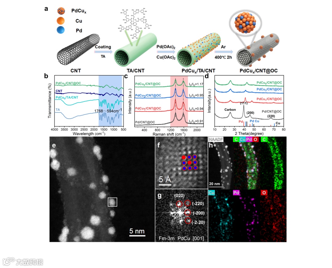 图1. PdCux/CNT@OC催化剂的制备示意图及其结构表征,包括FT-IR、Raman、XRD、HAADF-STEM及EDS元素分布图。
