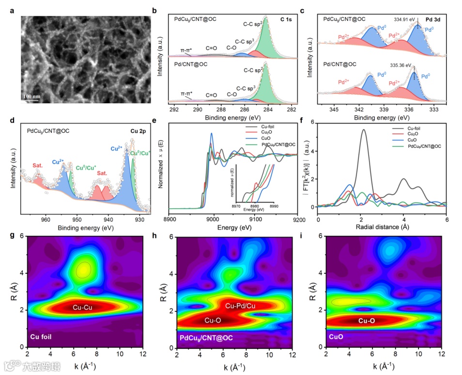 图2. PdCu9/CNT@OC的XPS、XANES、FT-EXAFS及WT-EXAFS表征结果,证明Cu-O-C界面与PdCu合金骨架共存。
