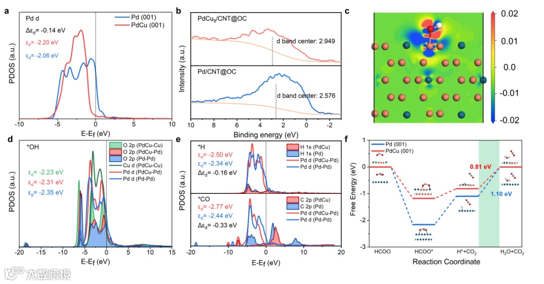 图4. Pd与PdCu模型的d带中心、差分电荷密度、PDOS以及FOR自由能图,揭示Cu-O-C界面级联电催化机理。