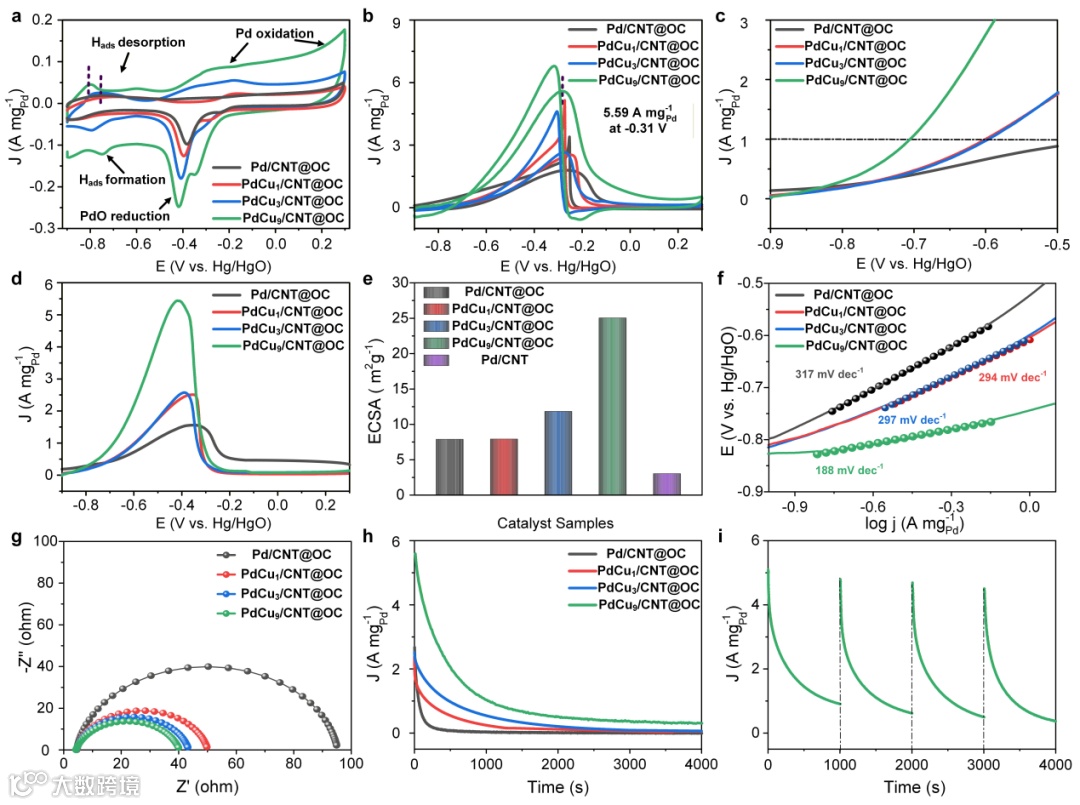 电化学测试结果表明,PdCu9/CNT@OC展现出最佳FOR性能。其峰值质量活性达到5.59 A mg Pd-1(-0.31 V vs. Hg/HgO),约为商业Pd/C的4.86倍;而对应的Pd负载仅为1.54 wt%,体现出极高的贵金属利用效率。与此同时,PdCu9/CNT@OC具有最大的ECSA(24.9 m² g Pd-1)、最小的Tafel斜率(188 mV dec-1)以及更低的电荷转移阻抗,说明其界面电子转移效率与反应动力学更优。抗中毒方面,其If/Ib值达到0.82,且CO剥离电位明显负移,表明对中间体累积具有更强耐受能力;在长期稳定性测试中,材料也保持了良好的结构和组分稳定性。
