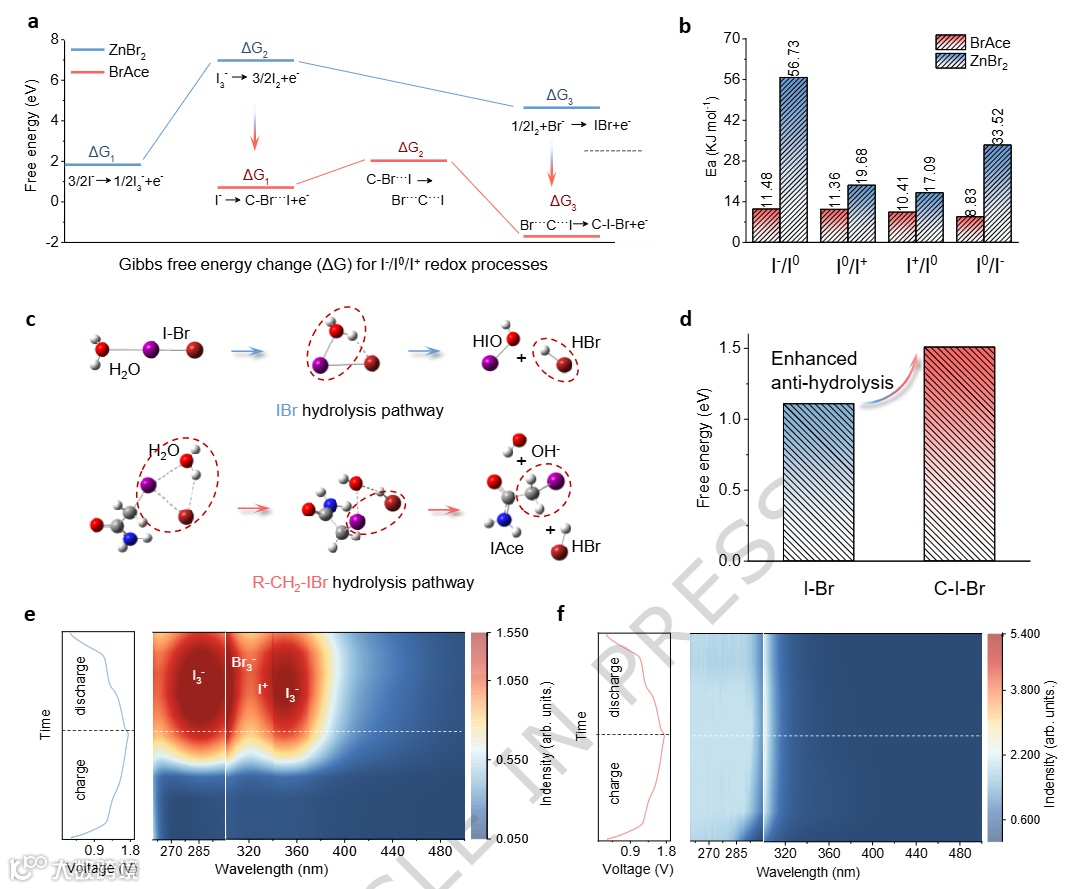 传统卤间化合物反应路径:在游离Br-电解液中,I+与Br-结合形成IBr,但I+存在高活性的δ空穴区域,易受到水的亲核进攻,因此I0/I+转化发生I-Br水解,活性物质大量损失,致使电池失效;碳-卤键取代新路径:BrAce的C-Br键与碘物种发生可逆的C-Br…I(0)↔C-I(+)-Br键的吸附-取代,吸电子酰胺基团调控I-Br键电子环境,弱化轴向δ空穴活性,使I+不再作为独立的活性中心,实现稀电解液中I0/I+氧化还原的稳定进行。