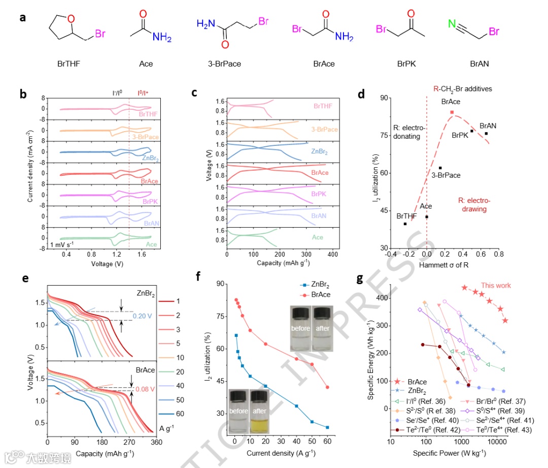 筛选具有给电子基或吸电子基的C-Br键添加剂激活I0/I+转化。哈密特指数(σ)用于量化有机添加剂的吸电子能力,引入该参数作为碳卤键取代策略的有效设计描述符。最优添加剂应能快速与激活的I+物种结合,并稳定带电产物。通过比较,过低的σ值无法激活I+,而过高的σ值会降低C-Br的溴亲核性,阻碍其与形成的I+物种的快速反应,导致I2利用减少。而σ指数适中的BrAce具有最高的碘利用率。而酰胺基与C-Br键的哈密特指数非常接近,可能更有利于实现碘可逆转化与高I2利用率的平衡。与游离的ZnBr2相比,BrAce电解液中电池的极化显著降低(1-60 A g-1下0.08 V vs 0.20 V),大电流下I2利用率提升1倍以上。并且基于碘正极计算的的比能量/功率达~450 Wh kg-1/~18 kW kg-1,远超传统两电子碘、溴及硫族氧化还原体系。
