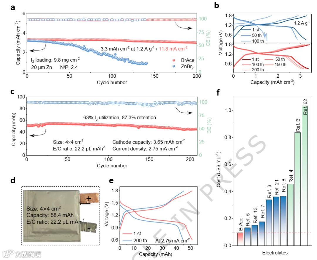 低N/P比(N/P=2.4),即9.8 mg cm-2碘负载、20 μm薄锌负极条件下,BrAce体系循环200次后面容量保持3.3 mA h cm-2,容量保持率达到90.4%;而ZnBr2体系在25次循环后容量快速衰减。组装的4×4 cm2 的软包电池性能优异,表明其具备规模化制备潜力; BrAce电解液成本低至0.1 US$ mL-1,远低于传统高浓度卤素盐电解质以及共晶电解液;且添加剂策略具有高离子电导率、低粘度、高安全性等特点,而且工艺简单,易于制备,展现出较大的应用潜力。