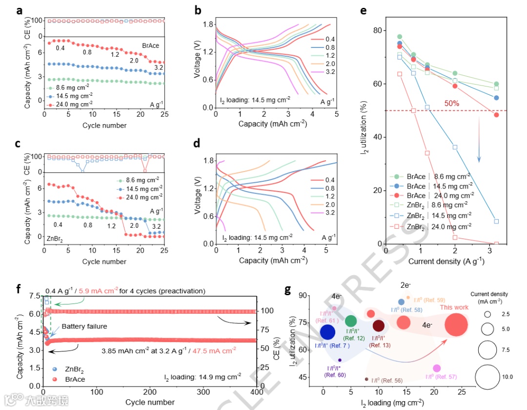 高倍率性能:40 A g-1的大电流下,BrAce体系稳定循环16000次,碘利用率达到55.2%,容量保持率为95.6%;高碘负载性能:24.0 mg cm-2超高碘负载下,BrAce体系在1.2 A g-1、2 A g-1下的I2利用率分别达65.2%、59.2%,远高于ZnBr2体系的34.2%、2.5%;循环稳定性:14.9 mg cm-2碘负载下,BrAce体系在3.2 A g-1/47.5 mA cm-2下循环超400次,面容量达到3.85 mA h cm⁻²,容量保持率达到99.8%、I₂利用率61.5%;而ZnBr2体在7次循环后容量急剧衰减并发生短路。与已报道锌碘电池相比,BrAce体系在高负载,大倍率下碘利用率显著提升。