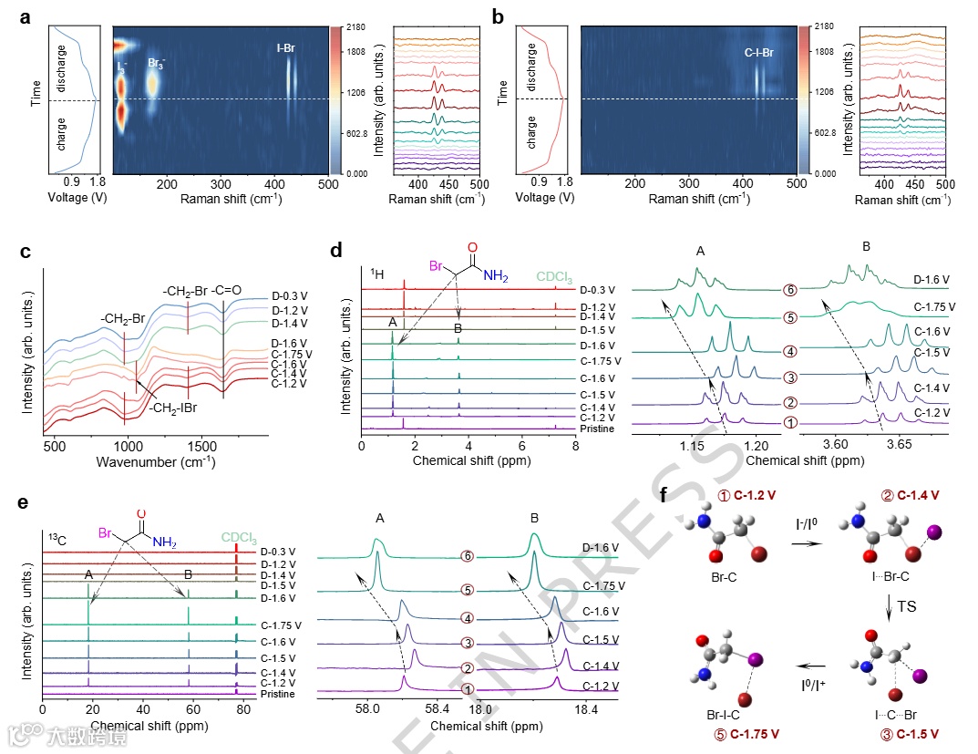 首先通过原位拉曼光谱与非原位 XPS 光谱,证实了卤间化合物与碳-卤化合物之间的化学性质存在本质差异:BrAce体系中仅检测到可逆的I+信号,无I3-、Br3-特征峰,证实I+物种稳定且无水解/穿梭效应;与传统的I-Br信号相比表现出明显的红移以及强度下降,这归因于BrAce中的酰胺基降低了相邻原子或官能团的电子密度,从而降低了碘中间体的极化率。原位 ATR-IR 光谱与非原位 1H / 13C NMR 光谱,证实在充放电过程中,BrAce 分子中的 NH2-C (O)- 结构未被破坏,而末端 -CH2-Br 发生了可逆重构,并为识别 I+与 C-Br 键的结合位点提供了关键信号;LC-MS 光谱,直接证实了充电产物中存在 R- CH2-IBr 结构;而NMR 光谱对比以及碘显色反证实有机卤化物的化学性质更接近 IAce(C-I键),而非 BrAce(C-Br键)。多种光谱结合将碳卤键反应路径解析为五步:I-/I0阶段形成Br-C…I(0)、异构化生成I(0)…CH2…Br、I0/I+阶段形成C-I(+)-Br、I+/I0阶段还原为I2与BrAce、I0/I-阶段还原为I-,实现C-Br键与C-I-Br键的可逆转化。