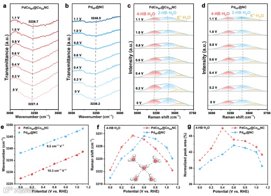 通过PdCo合金化与基底CoSA介导耦合,使体系功函数降低(UPS结果表明PdCoNP@CoSANC的功函数5.27 eV,低于PdNP@NC的5.35 eV)。由于功函数与EPZC呈正相关性,因此功函数降低代表EPZC负移。同时,作者使用电化学方法测得PdCoNP@CoSANC的EPZC值的确比PdNP@NC小。原位ATR-SEIRAS和Raman光谱证实,在ORR工作电位下,PdCoNP@CoSANC表面具有更强、更有序的氢键网络。有序的界面氢键网络通过Grotthuss mechanism机制促进质子定向跃迁,降低*OH加氢的能垒,有利于提升ORR动力学;同时,结构更规整的氢键网络可形成更薄的双电层,从而使质子更有效地从界面水转移到表面吸附的氧中间体。这些结果突显了基底CoSA 和 PdCo纳米合金颗粒在调控局部双电层微环境中的界面水动力学起关键作用。