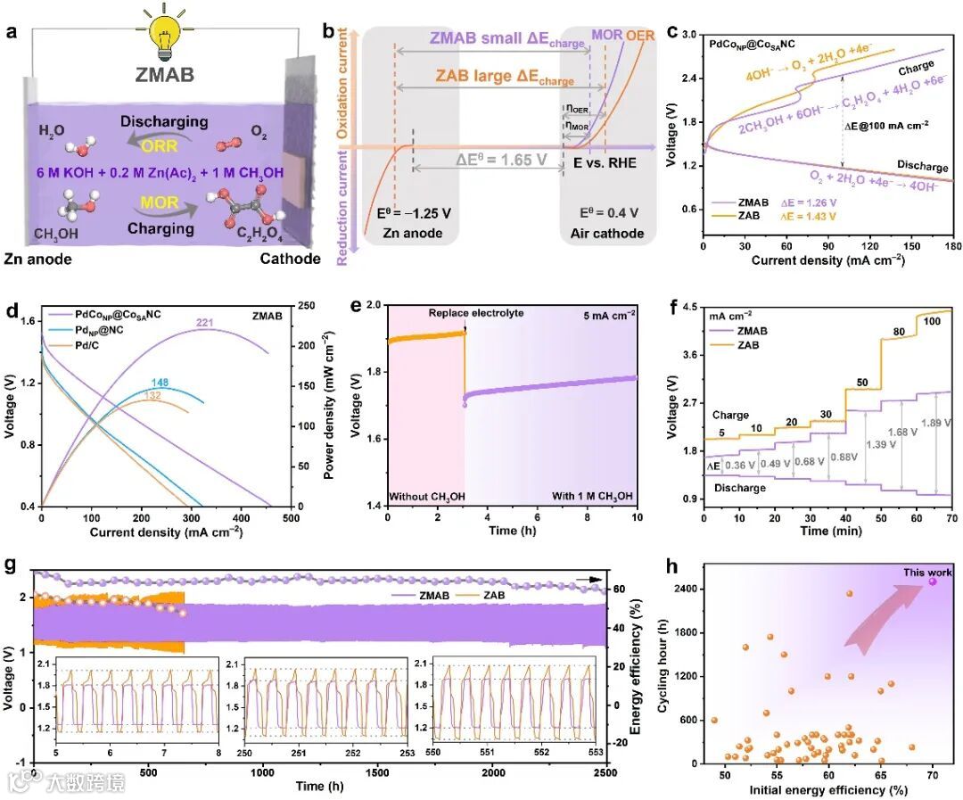 基于PdCoNP@CoSANC表现出优异的ORR/MOR活性,所构建的ZMAB可实现高倍率至100 mA cm−2,循环寿命>2500 h,初始往返能效约70%,且2000 h后,往返效率仍高达64%。同时,作者对比ZMAB和传统水系ZAB电池,发现ZMAB避免了传统ZAB中碳酸盐沉积与催化剂劣化等问题,并将长寿命归因于更低工作电位的MOR及催化剂双功能稳定性。