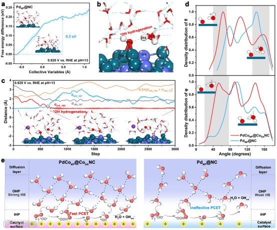 为了更好地模拟PdCoNP@CoSANC在实际电催化条件下的界面微环境,作者采用恒电位混合溶剂模型研究了速率决定步骤,即*OH氢化。在 PdCoNP@CoSANC中,*OH 从附近的界面水中接受一个质子,在约 0.3 ps 内生成 OHsol− 和 H2O,这表明*OH氢化步骤非常迅速。相比之下,PdNP@NC 的 *OH 氢化过程较为缓慢。同时,在开路电压下,对界面电位的进一步分析表明,PdCoNP@CoSANC比 PdNP@NC携带更多的正电荷。催化剂表面电荷密度的变化导致了两个关键结果:(1)更多水分子采用 O-down构型;(2)PdCoNP@CoSANC界面上水形成的氢键网络更加有序。O-down构型促进了 OHsol−产物中带负电荷的 O 原子与带正电荷的表面之间的静电相互作用,使得*OH氢化更容易进行。