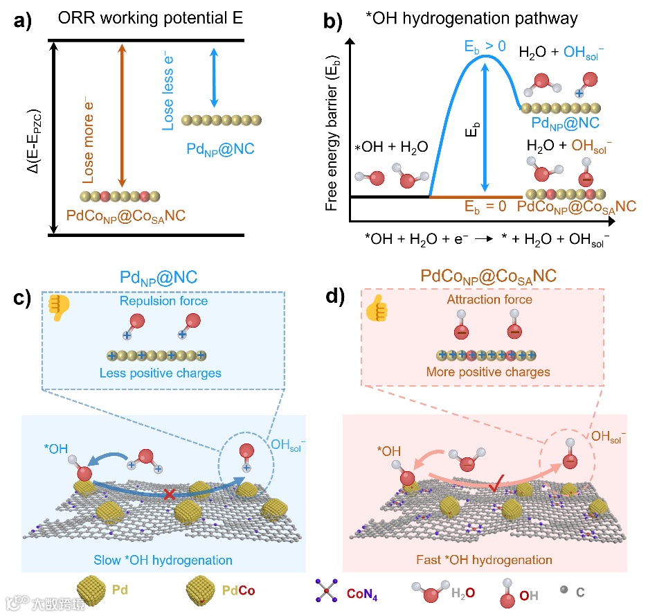钯基催化剂为研究氧还原反应中的双电层行为提供了一个合适的平台。首先,钯材料的界面能可以通过掺杂、晶面控制和合金化进行灵活调控,从而调节其与双电层中水分子的相互作用。其次,Pd(111)的零电荷点(EPZC)位于碱性ORR的有效电位范围内,使其表面电荷对原子级扰动极其敏感。当ORR工作电位 E > EPZC 时,电极表面带正电,其大小由Δ(E−EPZC)决定;同一工作电位下,EPZC越低,Δ(E−EPZC)越大,界面电场越强、表面正电荷越多。那么,界面H2O中富电子的O端朝向催化剂表面(即:O-down取向)。从而静电吸引带负电的OHsol-等物种,并驱动其在界面的构型/取向发生改变,更有利于降低*OH氢化相关的自由能势垒,如下图所示。