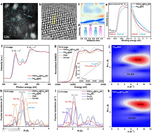 高丽大学姜龍默教授团队与南开大学、郑州大学周震教授团队等展开国际合作,在Angew. Chem. Int. Ed国际期刊上发表题为“Reoriented Interfacial Water Structure Around Pd Enhances Oxygen Reduction Kinetics in Zn–Methanol–Air Batteries”研究文章。该文章提出通过基底Co单原子(CoSA)和PdCo合金效应改变催化剂的零电荷电位(EPZC)来调节界面电荷,进而调控界面水在催化剂表面的取向构型,促进氧还原反应动力学。作者构建了PdCoNP@CoSANC(PdCo合金纳米颗粒负载在Co单原子耦合的N掺杂碳框架)作为双功能ORR/甲醇氧化(MOR)催化剂。原位表征与理论计算证明:基底CoSA和PdCo合金效应共同作用降低了PdCoNP@CoSANC功函数并使EPZC负移,使得在ORR工作电位下,其表面带更多的正电荷,促进界面H₂O从H-down翻转为O-down构型,增强氢键网络并促进*OH氢化(ORR最后一步反应:)。最终,PdCoNP@CoSANC在ORR 中实现了 0.937 V 的优异半波电位和 2.58 A mgPd−1的质量活性,在MOR 中实现了 6.15 A mgPd−1 的质量活性,优于 PdNP@NC 和商业 Pd/C。基于其优异的ORR/MOR性能,组装的锌甲醇空气电池(Zn–methanol–air,ZMAB)表现出高功率密度、高倍率(100 mA cm-2)、长寿命(2,500 h)及能量效率(70%)。
