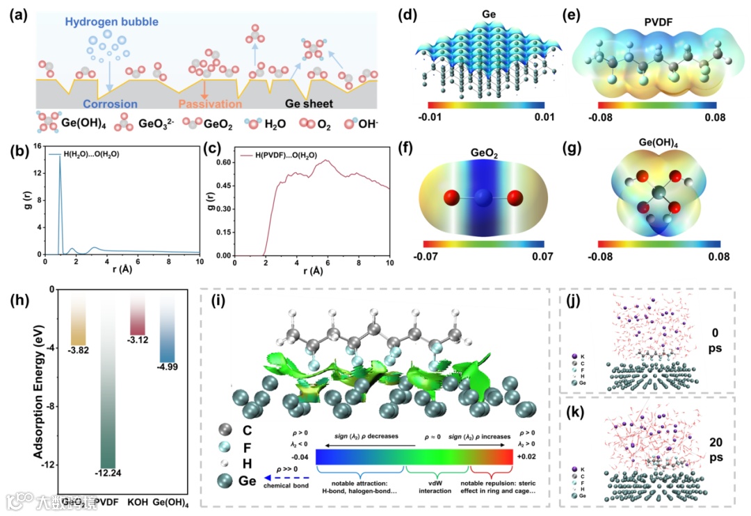 为了应对锗空气电池中锗阳极材料的钝化和析氢腐蚀这两个共同造成阳极界面失稳问题,研究提出了一种通过PVDF调控锗阳极界面的策略。PVDF通过其对锗表面的较强亲和力,使得其能够在Ge表面稳定吸附,从而抑制GeO2钝化层在阳极表面的成片形成并减缓析氢腐蚀。通过电势分布和吸附能分析,研究表明PVDF优先占据Ge表面的位点,削弱了GeO2的吸附倾向。这一界面稳定化策略有效地抑制了Ge阳极表面的钝化问题,而其疏水性主链又削弱了阳极析氢腐蚀的程度,改善了锗空气电池的长期稳定性,为解决锗空气电池中的界面失稳问题提供了新思路。