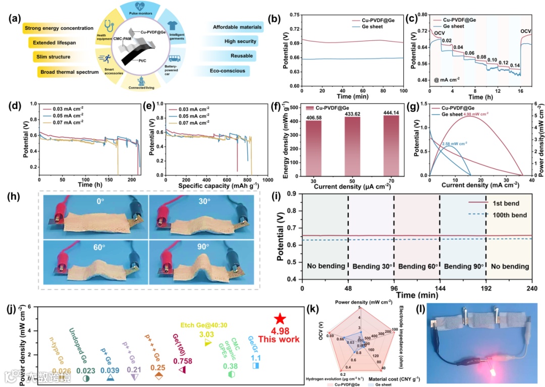 图5. 基于Cu-PVDF@Ge阳极的柔性锗空气电池的性能和演示。