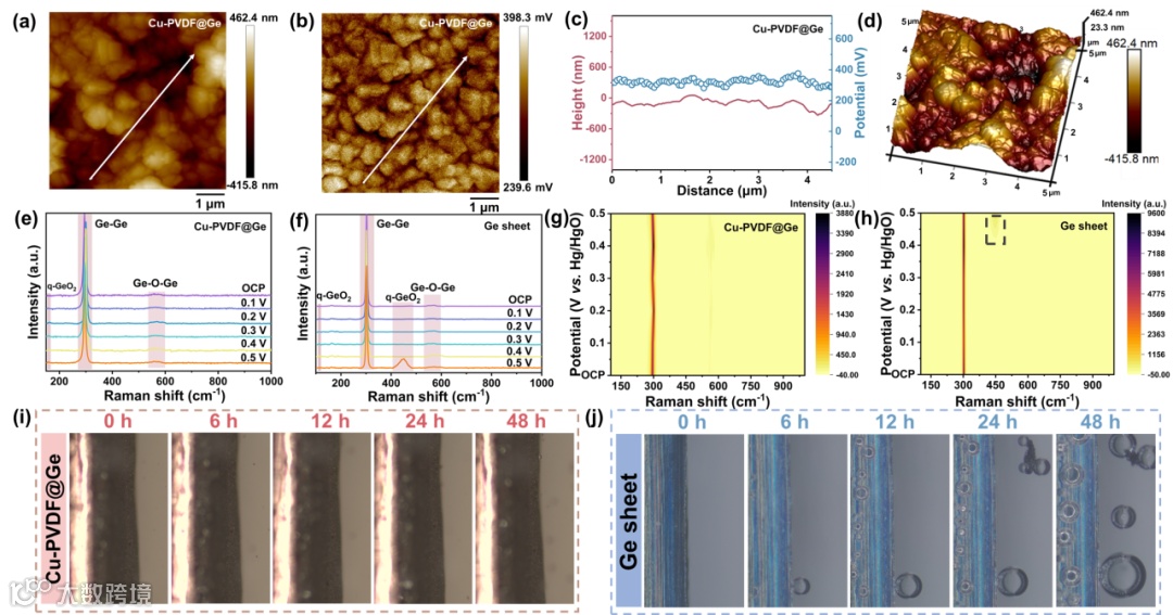 通过原子力显微镜(AFM)和开尔文探针力显微镜(KPFM)对Cu-PVDF@Ge阳极进行表征,结果显示PVDF与Ge颗粒在旋涂过程中形成了稳定的表面结构和较为均匀的阳极表面表面电势分布。原位拉曼光谱和原位光学显微镜进一步揭示了阳极表面钝化层生成与析氢腐蚀的演化过程,相较于没有保护的纯锗片而言,PVDF有效稳定了Cu-PVDF@Ge阳极的微观反应界面,界面失稳情况得到明显改善。