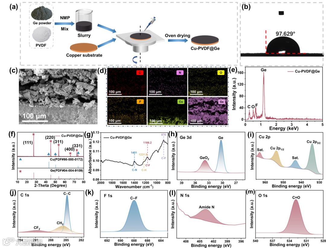 图3. Cu-PVDF@Ge阳极的微观结构和界面反应分析。