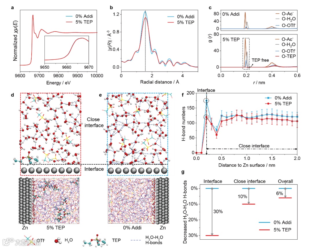图4 TEP在低表面张力电解质中的作用。a,b,0% Addi和5% TEP的Zn K边X射线吸收近边结构谱图(a)和扩展X射线吸收精细结构谱图(b)。c,0% Addi和5% TEP的径向分布函数。d,e,5% TEP和0% Addi在锌表面上进行分子动力学模拟的快照。f,H₂O–H₂O氢键的平均数量与到锌表面距离的函数关系。g,比较5% TEP与0% Addi在界面处(0.2 nm)、接近界面处(0–2 nm)以及整个电解质中H₂O–H₂O氢键的减少情况。