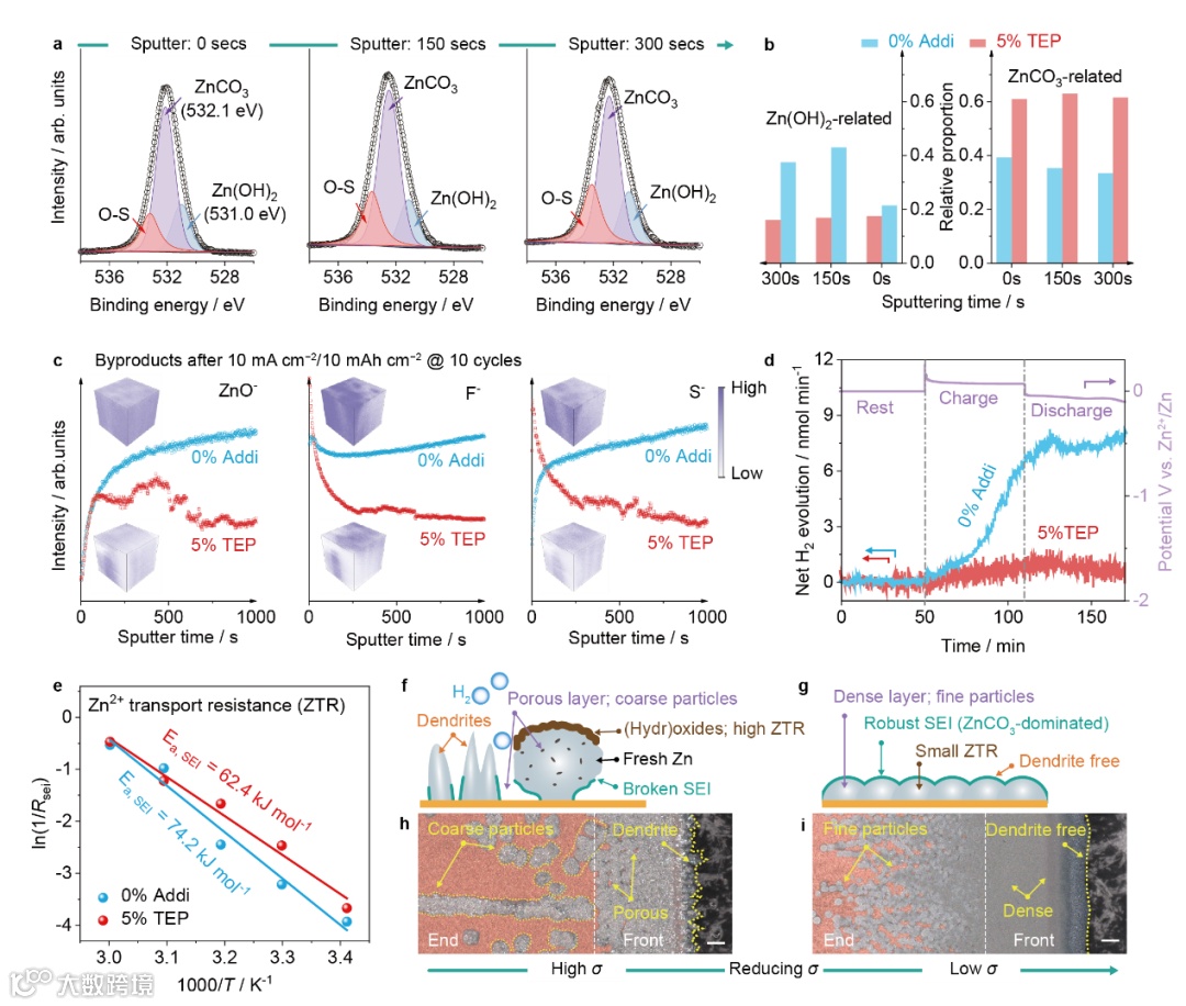 图3 σ控制的锌SEI及副反应。a, 在5% TEP中深度循环后锌负极的O 1s XPS谱图。b, 不同溅射时间后ZnCO₃和Zn(OH)₂相关组分的含量。c, ZnO⁻、F⁻和S⁻碎片离子的相对强度随溅射时间的变化。d, 在5 mA cm⁻² / 5 mAh cm⁻²下锌沉积/剥离过程中净H₂的生成量。e,锌/电解液界面的阿伦尼乌斯分析。f-i, 在严苛电化学条件下,高σ(f, h)与低σ(g, i)电解液中锌沉积/剥离时的界面行为示意图(f, g)和原位观察图(h, i)。图h和i是在10 mA cm⁻²电流密度下沉积450秒时拍摄的。比例尺为100 μm。