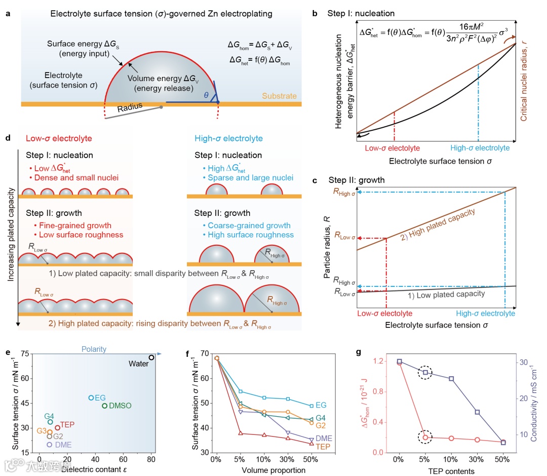 图1 σ调控的锌成核与生长。a. 锌非均相成核与生长的热力学示意图。b. 电解液的σ与锌非均相成核能垒及锌临界晶核半径的关联。c. 低和高沉积容量条件下,σ与锌颗粒半径的关系。d. 锌在低σ和高σ电解液中成核与生长的示意图。a和d中的灰色半球代表沉积在基底上的锌。e. 介电常数(ε)、溶剂极性与σ之间的关联。f. 添加不同含量的低极性溶剂对电解质σ的影响。g. 不同TEP含量对锌成核能垒及离子电导率的影响。