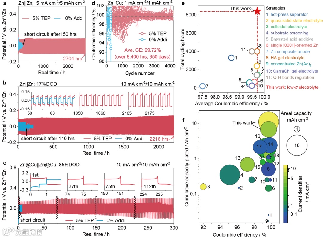 Zn||Cu半电池在1 mA cm⁻² / 1 mAh cm⁻²条件下,实现了99.72% 的平均库仑效率,稳定运行超过8400小时(350天)。