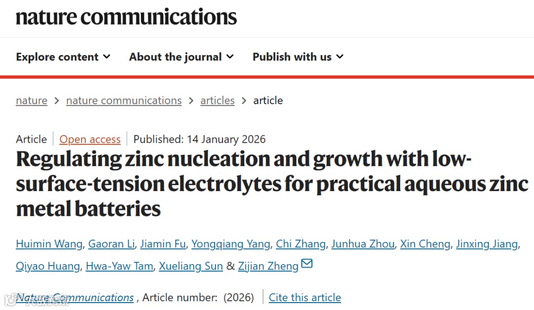 近日,香港理工大学郑子剑教授团队在 Nature Communications 上发表题为“Regulating zinc nucleation and growth with low-surface-tension electrolytes for practical aqueous zinc metal batteries”的研究论文。该工作将电解液表面张力(σ)确立为调控水系锌金属电池性能的关键设计参数,建立了σ与锌沉积行为(成核和生长)之间的定量理论关系。研究表明,降低σ可同时降低锌成核能垒、减小临界晶核尺寸,并抑制生长阻力,从而引导锌从“稀疏成核/粗晶生长”向“致密成核/细晶生长”转变。该“致密成核/细晶生长”模式增强了固态电解质界面(SEI)的稳定性,并显著抑制了副反应。在苛刻的电化学条件下,该策略使锌金属负极表现出优异的循环稳定性和高可逆性。该研究为发展低成本、高安全性、长寿命的水系锌金属电池提供了新的可行路径。