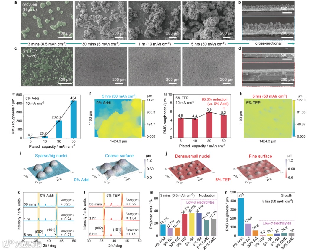 图2 高、低σ电解液中锌沉积物的表征。 a–d,高σ电解液(0% Addi)或低σ电解液(5% TEP)中,在10 mA cm⁻²电流密度下锌沉积物的形貌。e–h,10 mA cm⁻²下锌沉积物的均方根粗糙度随沉积容量的变化(e, g);10 mA cm⁻² / 50 mAh cm⁻²下锌沉积物的激光扫描共聚焦显微镜图像(f, h)。i, j,锌成核后生长的有限元模拟。k, l,10 mA cm⁻²下沉积不同时间后,锌沉积物的X射线衍射图谱。m,10 mA cm⁻²下沉积3分钟后锌沉积物的投影面积比较。n,10 mA cm⁻²下沉积 5小时后锌沉积表面的均方根粗糙度的比较。