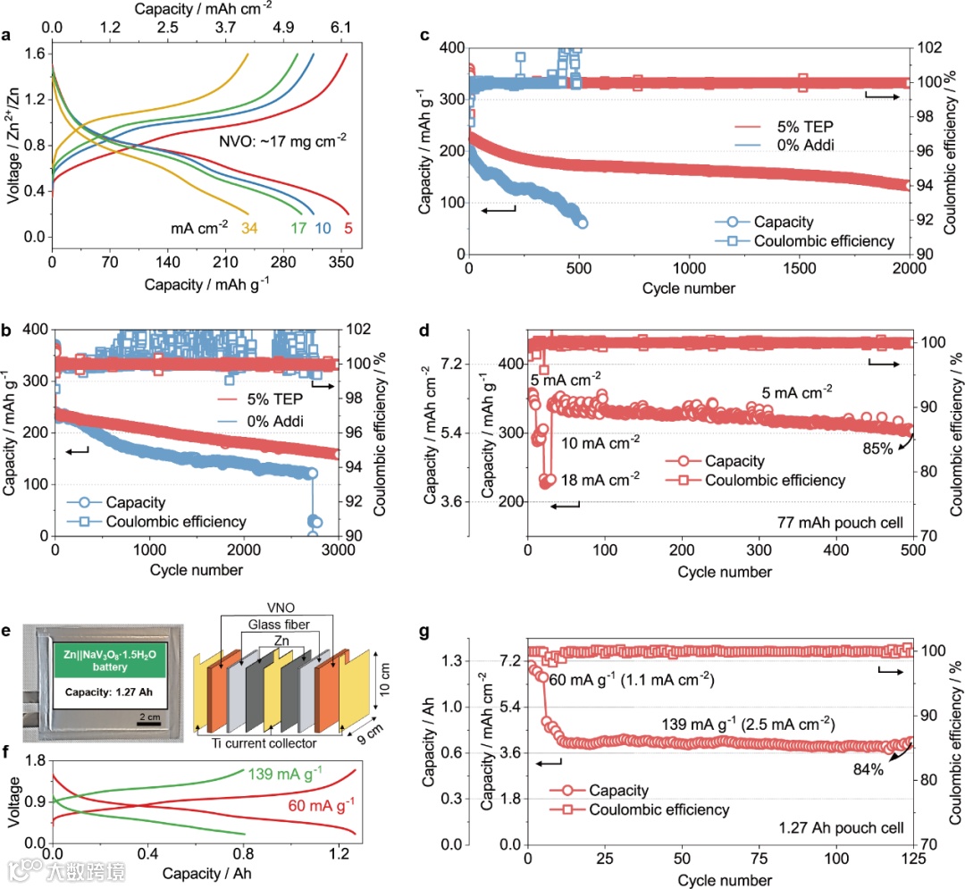 图6 锌||NVO全电池的电化学性能。a,5% TEP中、不同电流密度下锌||NVO全电池(NVO负载量:~17 mg cm⁻²)电压曲线。b,在0% Addi或5% TEP中、34 mA cm⁻²电流密度下锌||NVO全电池的长循环稳定性对比,锌负极厚度为100 μm,N/P比为9.6。c,在低N/P比(1.9)和高电流密度(34 mA cm⁻²)条件下,锌||NVO全电池的长循环稳定性,锌负极厚度为20 μm。d,在低N/P比(2.8)和高电流密度(5、10和18 mA cm⁻²)条件下,容量为77 mAh的单层锌||NVO软包电池的长循环稳定性。e,1.27 Ah锌||NVO软包电池的光学照片和结构示意图。f, g,1.27 Ah锌||NVO软包电池的电压曲线(f)和长循环稳定性(g)。