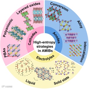 本文系统性地回顾了基于高熵策略的碱金属离子电池正极、负极、液态电解质及固态电解质领域的最新进展,重点阐释高熵结构如何缓解材料本征缺陷并提升电化学性能。高熵策略能有效缓解正极材料中的复杂相变,同时增强层状过渡金属氧化物、聚阴离子化合物及普鲁士蓝类似物材料的机械稳定性以及热稳定性。此外,该策略又可加速离子/电子扩散动力学,从而显著提升正极材料的动力学和倍率性能。值得注意的是,这些增强特性并非孤立存在,通常多重优势在同一高熵体系中协同共存。对于负极材料,高熵结构设计实现了多元素协同作用,能够缓解体积膨胀,改善电子/离子扩散,同时确保稳定的结构演变与优异的储能特性。在液态电解质中,多盐/多溶剂高熵体系显著提升离子电导率,拓宽工作温度范围,增强界面稳定性。固态电解质同样受益于此策略,实现了更高离子电导率与更优界面相容性。高熵材料为新一代电池研究与应用搭建了全新平台。其多样性与高效性为未来电池技术发展开辟广阔前景。