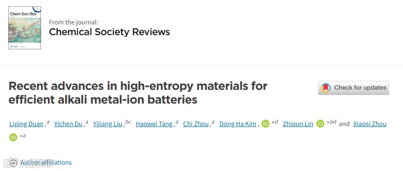 近日,南京师范大学周小四教授团队联合新加坡国立大学林志群教授以及梨花女子大学Kim Dong Ha教授在期刊Chemical Society Reviews上发表题为“Recent advances in high-entropy materials for efficient alkali metal-ion batteries”的综述文章。这篇综述深入探讨了碱金属离子电池中高熵材料的四大核心效应,揭示了其在提升碱金属离子电池正极/负极材料、电解质、电极/电解质界面及全电池性能中的关键作用。该研究不仅系统总结了高熵材料的最新进展和先进表征技术,还详细阐述了其结构设计策略和基础指导原则。