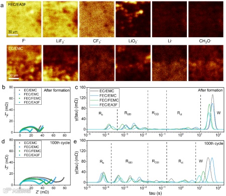 图6 (a)使用FEC/EA3F和EC/EMC电解液的循环后石墨负极表面的飞行时间二次离子质谱(TOF-SIMS)结果,(b,d)软包电池在化成后和循环100圈后的电化学阻抗谱(EIS)Nyquist图及对其进行(c,e)弛豫时间分布(DRT)拟合后的阻抗分布结果。
