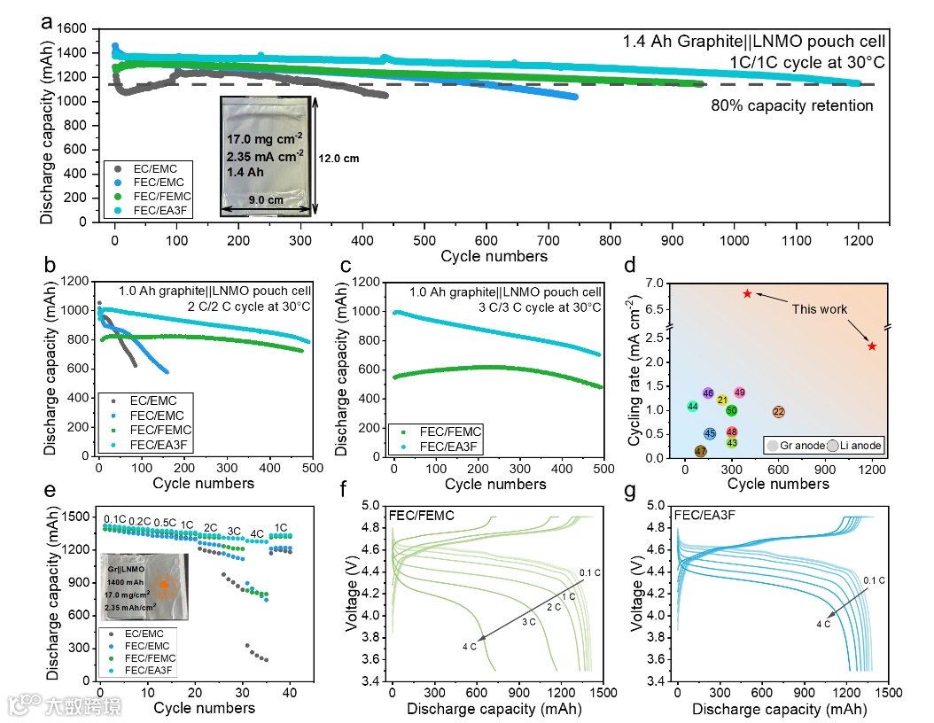 图3 (a)1C,(b)2C,(c)3C倍率下的循环容量曲线图,(d)该工作与此前报道的镍锰酸锂软包电池性能的对比图,(e)倍率测试结果及(f,g)充放电曲线图。