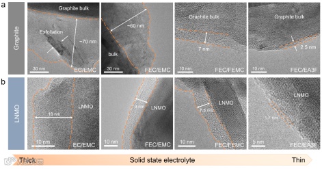 中等溶剂化结构设计显著减少了电解液在循环过程中溶剂参与的持续性分解。使用FEC/EA3F电解液的商用镍锰酸锂-石墨软包电池在1C,2C和3C倍率下分别实现了1200圈,500圈和350圈的循环寿命,远超此前在镍锰酸锂正极的软包电池中所报道的循环稳定性和倍率性能。通过倍率性能测试,实验进一步发现FEC/EA3F电解液能够显著降低电解液在快速充放电过程中的极化程度,电解液在快速充放电过程中的浓差极化对电池性能的影响大幅度减小。通过透射电子显微镜(TEM)分析正负极表面的固态电解质界相(SEI)发现,中等溶剂化结构设计显著减少了电解液在正负极表面的过度分解,有效降低了正负极SEI的厚度,使SEI在循环末期仍能保持在3 nm以下,是所设计电解液能够实现快速充放电长循环的关键因素。
