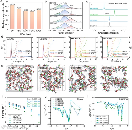 图2 (a)溶剂与Li+的结合能对比,(b)电解液的拉曼测试结果及其溶剂化结构占比分析,(c)核磁Li谱对比,(d)分子动力学模拟RDF函数结果及(e)溶剂化结构快照,(f)变温电导率测试,(g,h)充放电过程的锂离子扩散系数