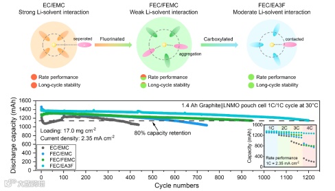 TOC 基于精确的溶剂分子结构设计实现中等溶剂化结构,使商用镍锰酸锂-石墨软包电池表现出优秀的循环稳定和倍率性能。