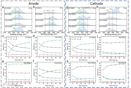 图5 循环后正负极材料的化学组成X射线光电子能谱(XPS)分析。石墨负极表面的(a)O1s和(b)F1s谱及(c-f)刻蚀过程中各元素占比的变化趋势。镍锰酸锂正极表面的(g)O1s和(h)F1s谱及(i-l)刻蚀过程中的元素占比变化趋势。